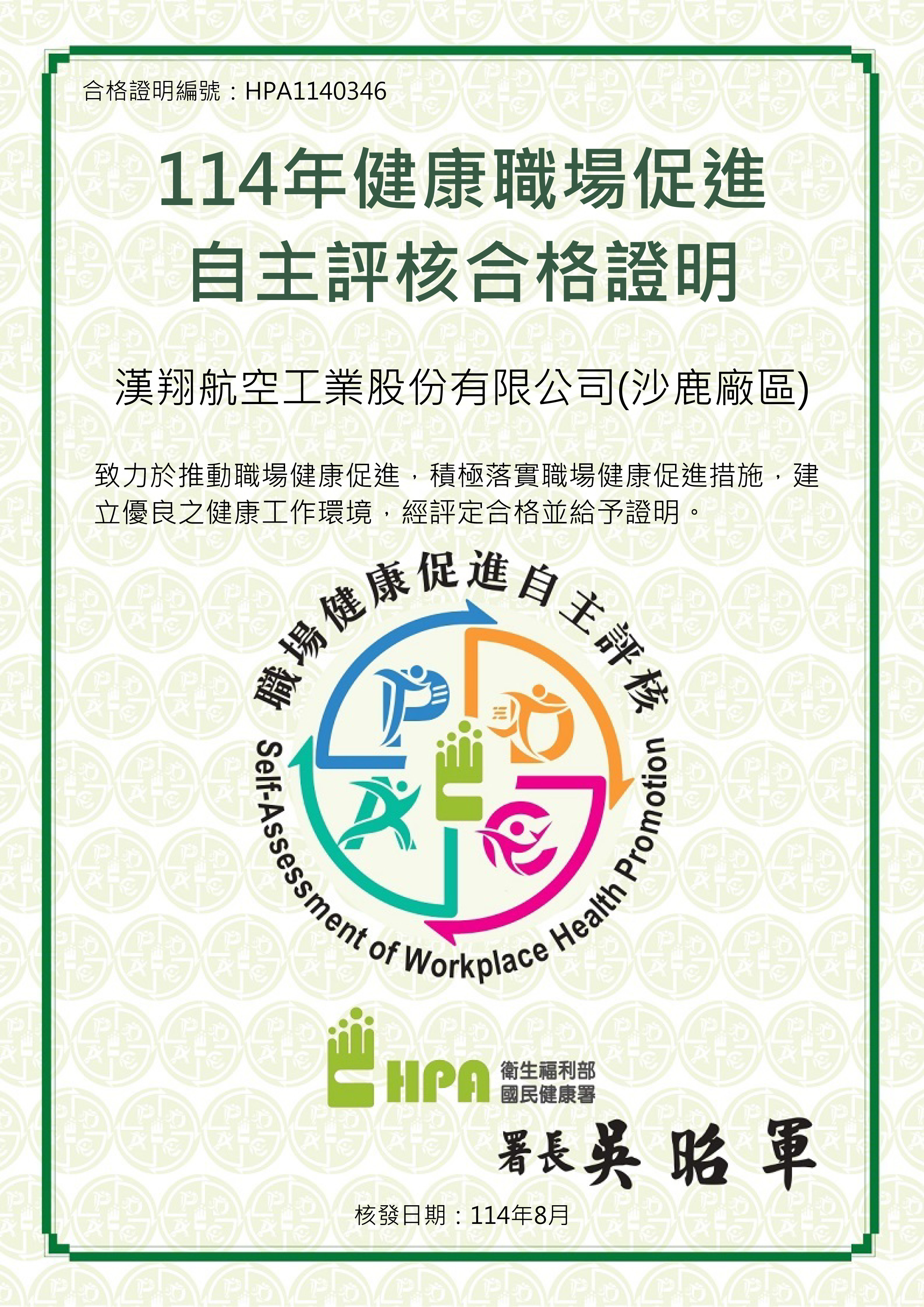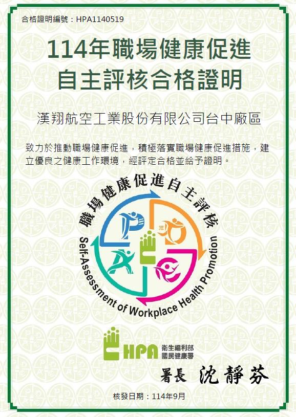 Home > About AIDC > Excellence Awards Excellence Awards 2025/09/01 the Self-Assessment of Workplace Health Promotion(AIDC Taichung Site) 2025/08/01 Sha-lu Site "Badge of Accredited Healthy Workplace" 2025/01/01 Badge of Accredited Healthy Workplace 2023/11/22 "Taiwan isport enterprise certification" by Sports Administration, Ministry of Education 2021/11/08 109 Annual "Green Procurement Award" 2021/06/04 The 7th Corporate Governance Evaluation TOP 5% 2021/05/07 Occupational Health Award 2020/11/12 2020 Taiwan isport calender AIDC runner-up Sport administration, Ministry of Education 2020/10/08 Occupational Health Award 2019/12/12 108 National Occupational Safety and Health Enterprise Benchmarking Award 2019/11/20 Engine Business Division won the Material Flow Cost Accounting Model Award from the Industrial Bureau in the year 108 2019/11/05 107 Five-Star Award for Excellent Occupational Safety and Health Unit 2019/11/04 Engine Business Division won the Corporate Sports Certification of the Sports Administration in the year 108 2019/11/01 i Taiwan iSport 2019/09/23 Taichung City Government awarded the first place in Group A of the 107 Workplace Health Enterprise Award 2019/08/11 AIDC obtained 「Diamond Supplier」 from Bombardier in 2019 2019/06/27 107 Annual Taichung Municipal Government Green Procurement Award 2018/12/17 "Award for Outstanding Performance of 2018 Pengcheng #32 " by National Police Agency, Ministry of the Interior 2018/12/12 AEF/AIDC received "Health Management Award for Outstanding Healthy Workplace 2018" presented by Mininstry of Health and Welfare 2018/12/07 AEF/AIDC received 27th term "ROC Enterprise Environmental Protection Silver Award" presented by Environmental Protection Administration, Executive Yuan 2018/12/05 AIDC received "Outstanding Enterprise Volunteer Group Award" presented by Ministry of Health and Welfare 2018/11/23 "Taiwan Corporate Sustainability Reportage Silver Award in Traditional Manufacturing Category" by Taiwan Corporate Sustainability Awards (TCSA) 2018/11/16 "Happy Workplace Three-Star Award" by Taichung City Government 2018/11/09 "2018 Smart Machinery Gold Award" by Ministry of Economic Affairs 2018/10/30 "Certificate of Appreciation for Blood Donation" by Taichung Blood Center 2018/10/25 "Taiwan iSport Enterprise Certification" by Ministry of Education 2018/09/28 "2017 Outstanding Occupational Safety and Health Company Award" by Ministry of Labor 2018/09/05 "2017 Occupational Safety and Health Five-Star Award" by Ministry of Labor 2018/08/27 "2018 Excellence in Corporate Social Responsibility Award" by the CommonWealth Magazine 2018/06/26 "Outstanding Green Procurement Award" by Taichung City Government 2018/01/03 "Certificate of Appreciation for Dedicated Service in Support of AMS-02 Program" by NASA