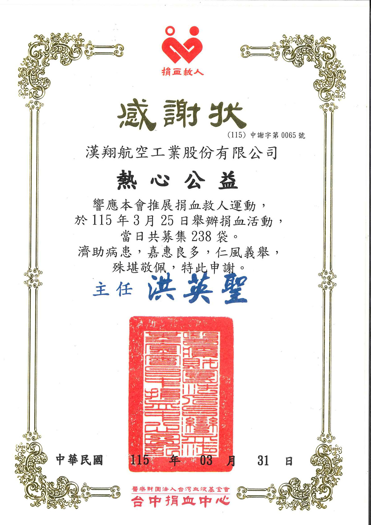 首頁 > 認識漢翔 > 榮獲獎項 榮獲獎項 2026/03/31 漢翔獲捐血中心『捐血救人感謝狀』 2025/09/01 衛福部國健署頒『114年台中廠區職場健康促進自主評核合格證明』 2025/08/01 衛福部國健署頒『114年沙鹿廠區職場健康促進自主評核合格證明』 2025/01/01 衛福部國健署頒『台中廠區 健康職場認證 健康職場標章』 2023/11/22 榮獲教育部體育署『運動企業認證』 2021/11/08 109年度綠色採購企業獎 2021/06/04 第七屆公司治理評鑑TOP 5% 2021/05/07 職場健康企業獎 2020/11/12 2020年isport運動年曆亞軍獎 2020/10/08 職場健康企業獎 2019/12/12 108年度國家職業安全衛生之企業標竿獎 2019/11/20 發動機事業處108年度榮獲工業局頒發物質流成本會計楷模獎 2019/11/05 107年度職業安全衛生優良單位五星獎 2019/11/04 發動機事業處108年度榮獲體育署企業運動認證 2019/11/01 教育部頒運動企業2019運動年曆冠軍獎 2019/09/23 台中巿政府頒107年度職場健康企業獎甲組第一名 2019/08/11 本公司榮獲Bombardier公司頒發鑽石供應商獎 2019/06/27 107年度台中巿政綠色採購獎 2018/12/17 獲得內政部警政署「107年鵬程32號工作績優獎」 2018/12/12 岡山廠獲衛福部107年績優健康職場『健康管理獎』 2018/12/07 岡山廠獲環保署第27屆中華民國企業環保獎『銀級獎』 2018/12/05 漢翔獲得衛福部『績優企業志工團隊獎』 2018/11/23 漢翔獲得TCSA 2018年傳統製造業組「臺灣企業永續報告銀級獎」 2018/11/16 漢翔獲得台中市『幸福職場三星獎』 2018/11/09 漢翔獲得經濟部107年『智慧機械金質獎』 2018/10/30 漢翔獲得捐血中心達標『捐血救人感謝狀』 2018/10/25 漢翔獲得教育部『運動企業標章』認證 2018/09/28 漢翔獲得勞動部評比『106年職業安全衛生優良單位獎』 2018/09/05 漢翔獲得勞動部評比『106年推行職業安全衛生五星獎』 2018/08/27 漢翔獲得天下雜誌大型企業「2018天下企業公民獎 」 2018/06/26 漢翔獲得台中市『綠色採購績優獎』 2018/01/03 漢翔獲得美國太空總署(NASA)『對AMS-02 品質與交期卓越貢獻感謝狀』