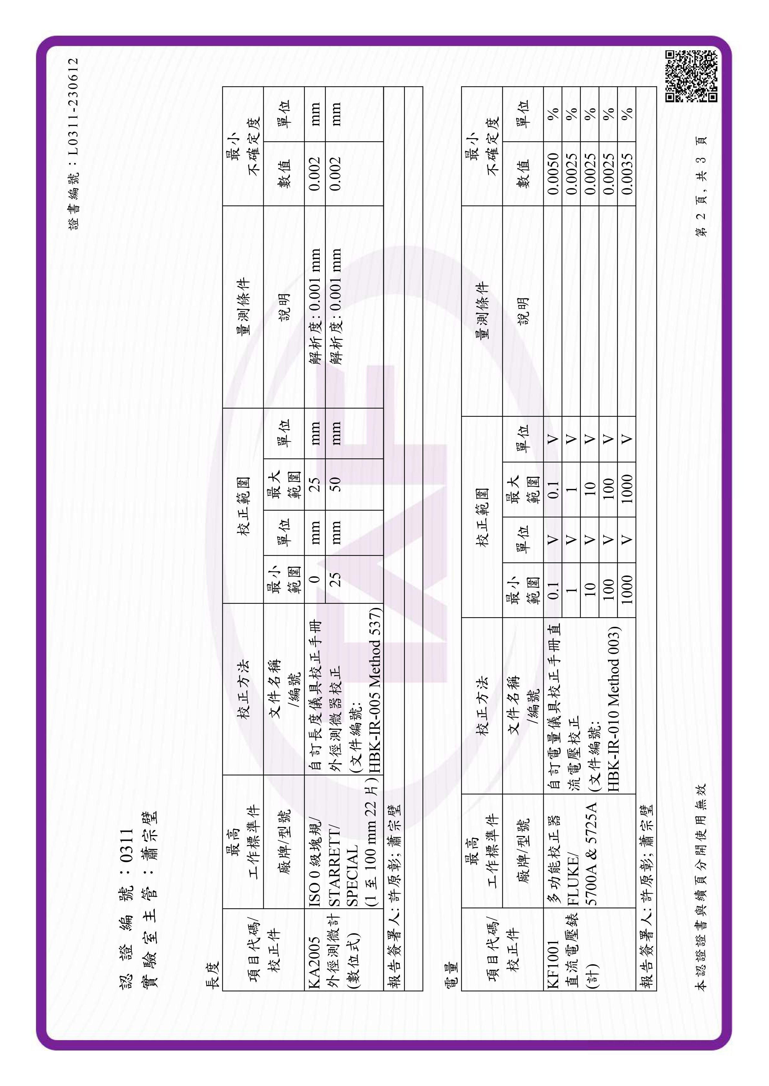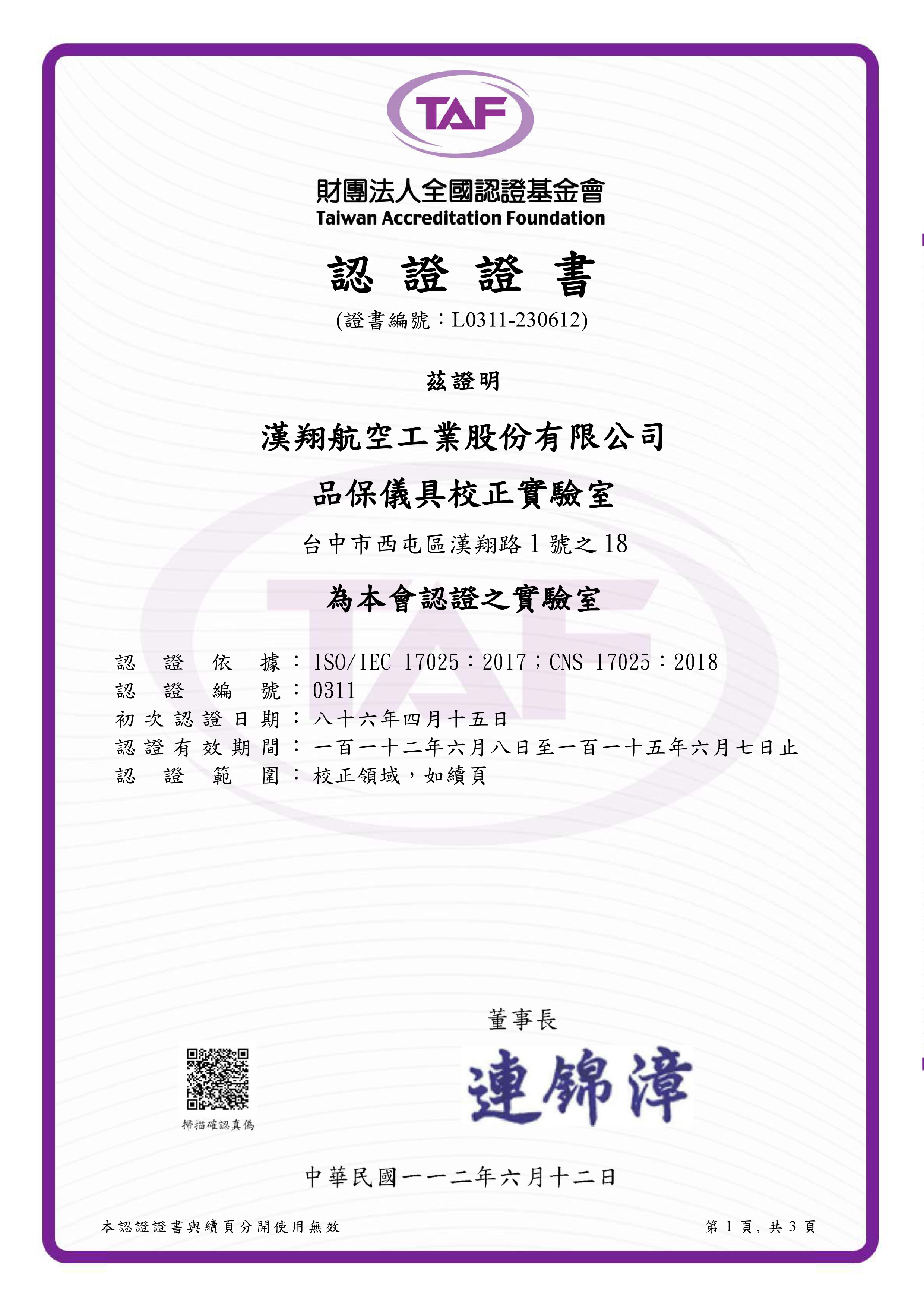 本公司校正實驗室品質系統採用 ISO/IEC 17025,校正量測追溯至國家或國際量測標準,運用已獲 歐美多家航空工業公司審查合格的高品質標準,提供業界最精確且快速的校正服務,項目如下:測長儀、錐孔規、表面粗度儀、量錶、卡尺、柱 塞規、厚薄規、分厘卡、水平儀、經緯儀、校準儀、 高度規、超音波測厚儀、黏度杯、力量計、磅秤、 扭力板手、扭力表、氣壓錶、油壓錶、壓力感測器、 溫度計、溫度控制器、熱處理爐、三用電錶等。